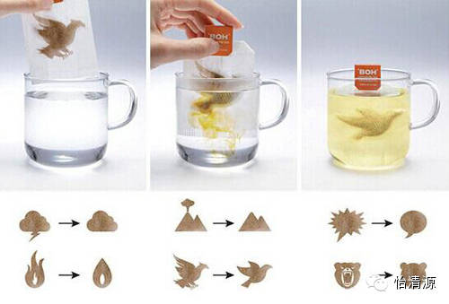 由广告代理商M&C Saatchi 为BOH 茶叶公司的甘菊茶设计的茶叶包,名为Transforming Tea Bags(变化的茶叶包),包里的茶叶造型有雷电、火山、烈火、老鹰等暗示暴躁、充满火气的形象,但这些茶叶包在水中浸泡一段时间后,造型会发生改变,雷电停了;火山熄灭了;烈火变成了平静的水;老鹰则变成了鸽子~