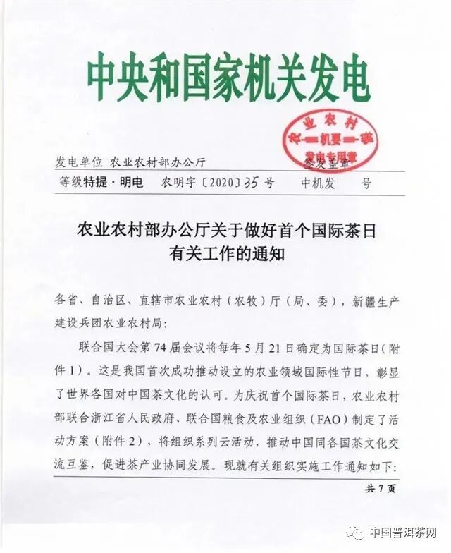 1、农业农村部办公厅关于做好首个国际茶日有关工作的通知