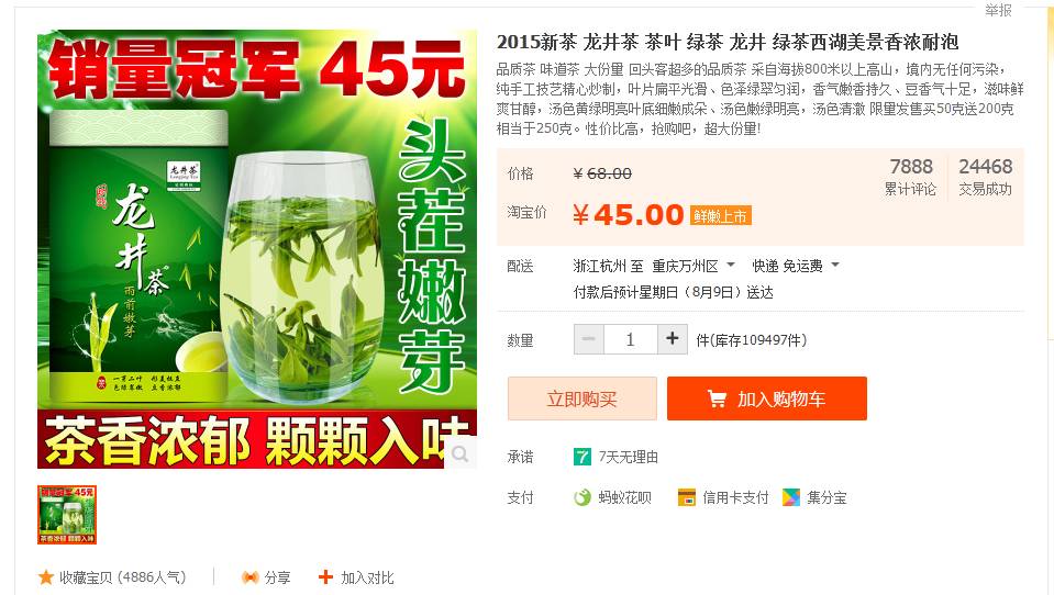 45元,50g。销量冠军?究竟是绿茶销量冠军?还是龙井销量冠军?麻烦店家你说清楚好嘛?不过2万4千多的成交,应该还是很受欢迎的吧~