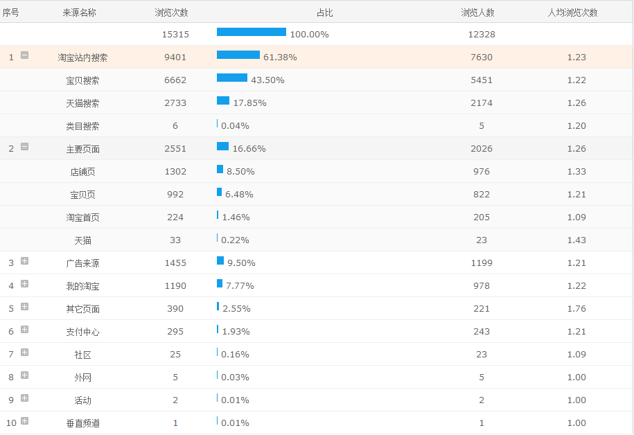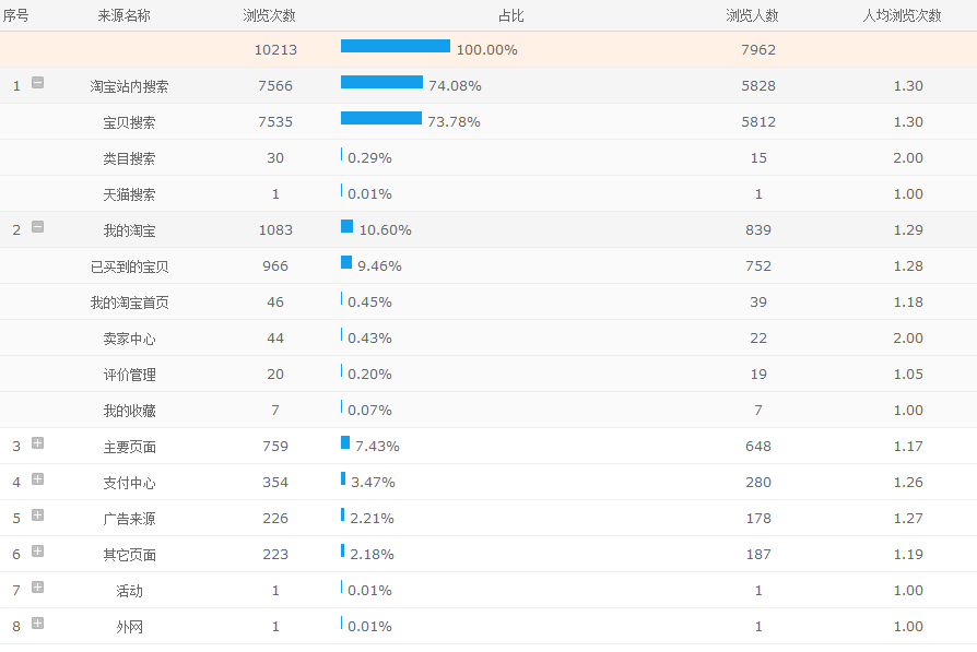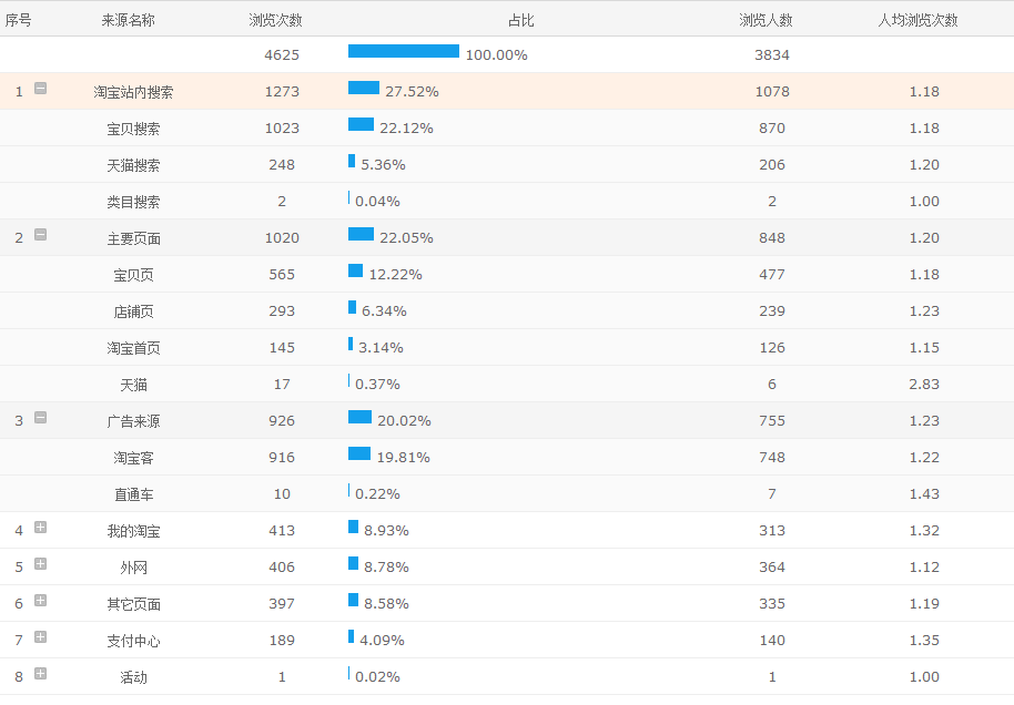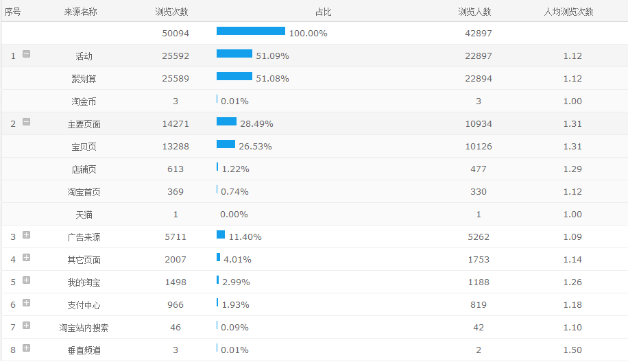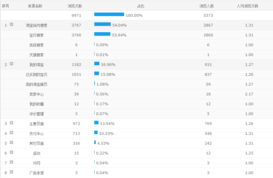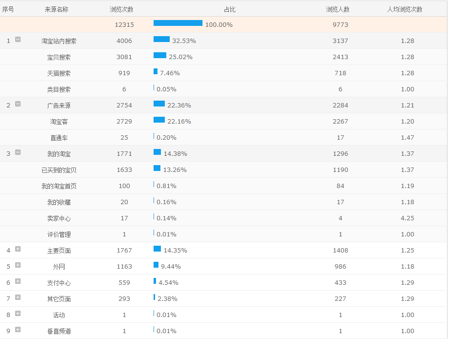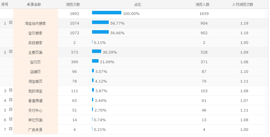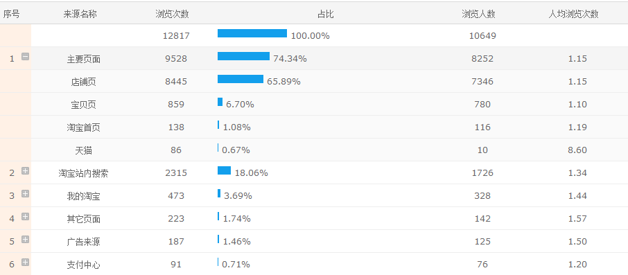 数据分析:店家的主要成交来源来自于宝贝搜索和宝贝页面。