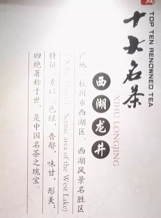 西湖龙井产于西湖风景名胜区,以龙井系群体种和龙井43为原料,龙井工艺,以泡后茶芽倒立,汤清香高形美为胜。