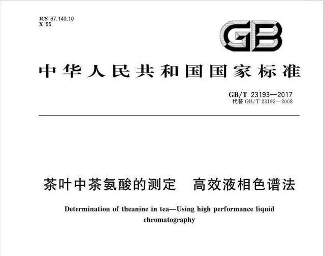 《茶叶中茶氨酸的测定 高效液相色谱法》(GB/T 23193-2017)与原标准有较大变化:测定原理和前处理过程完全不一样;前处理从原来加水80℃水浴浸提改为直接加沸水浸提;无净化和衍生步骤直接过0.45μm膜后直接进样。