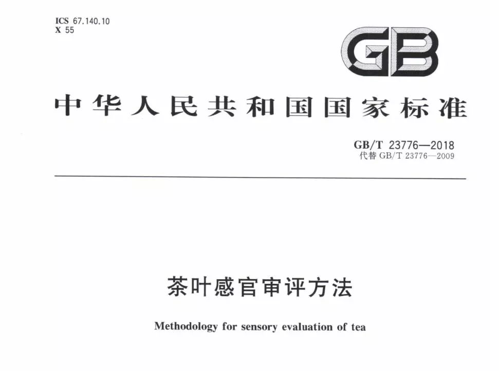 《茶叶感官审评方法》(GB/T 23776-2018),规定了茶叶感官审评的条件、方法和审评结果与判定,适用于各类茶叶的感官审评。茶叶感官审评是指审评人员运用正常的视觉、嗅觉、味觉、触觉等辨别能力,对茶叶产品的外形、汤色、香气、滋味与叶底等品质因子进行综合分析和评价的过程。该标准广泛应用于各级专家评审、企业的进货验证或出厂检验、检验机构的各种审评等。标准中有几个需要关注的方面:对审评环境和设备进行了规定,干评台面为黑色亚光,湿评台面为白色亚光;对茶叶审评人员应获有《评茶员》国家职业资格证书要求,持证上岗,身体健康,视力5.0及以上,持《食品行业从业人员健康证明》上岗,审评人员开始审评前更换工作服,用无气味洗手液把双手清洗干净,并在整个操作过程中保持洁净,评审过程中不能使用化妆品,不得吸烟。