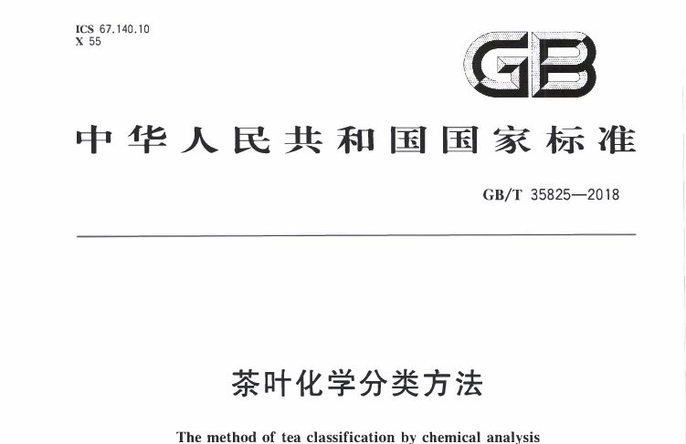 《茶叶化学分类方法》(GB/T 35825-2018)首次通过对六大茶类中主要化学成分含量进行检测,利用统计分析的方法筛选出能代表不同茶类的特征成分因子,利用特征性成分因子结合判别模型对茶样进行分类,判别未知茶样是绿茶、红茶、乌龙茶(青茶)、白茶、黄茶和黑茶其中之一,这是国家标准在从加工工艺或感官审评等传统基础茶叶分类学上的一种创新尝试;