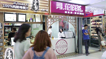 “寻花吻茶”开在地下人流量颇大的一条通道,靠近地下商场的入口,来往的行人一眼便能看到。先去点上一杯“寻花吻茶”,就可以开始在地下觅食、逛街啦!