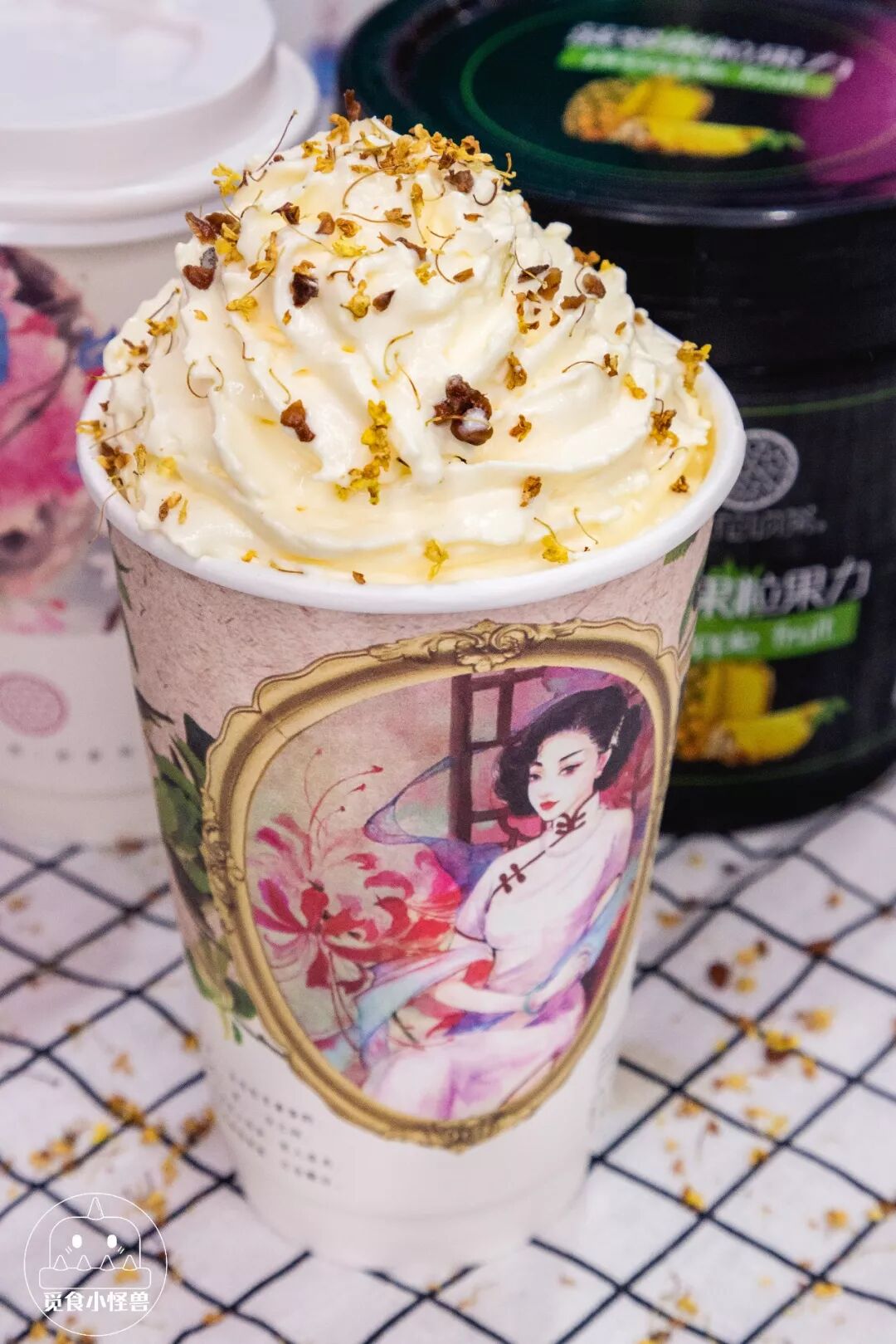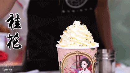 “茉莉花茶+牛奶”的茶底,再盖上满满的“雪顶奶油”,样子很像是小时候吃的雪糕杯。