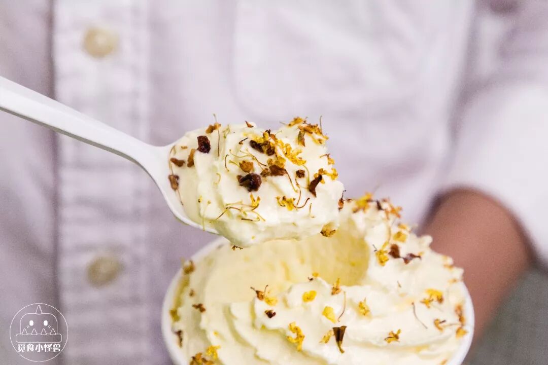 “雪顶奶油”成型后,再撒上桂花和核桃碎。奶油的口感很绵滑,要先吃完“雪糕”再喝茶。