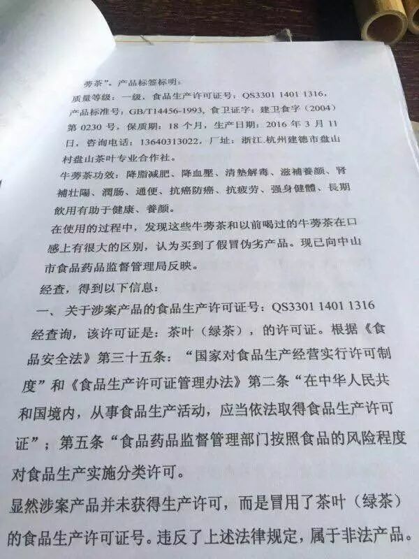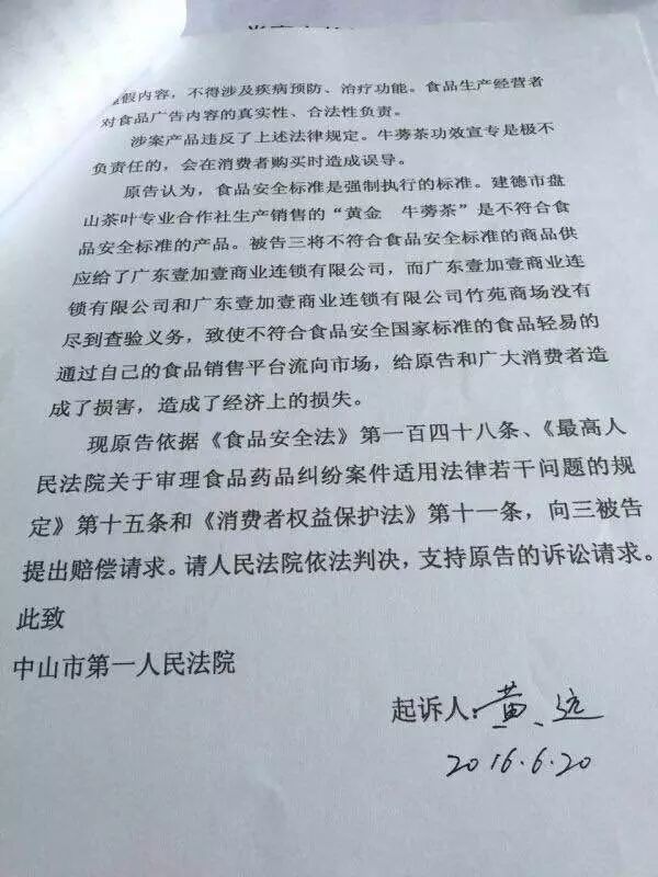 可杨女士没想到的是,一个月后,她收到了法院的传票。寄给杨女士的起诉状称,原告在收货时拍了收货视频,在拆箱验货时发现以上涉案茶叶没有标签、生产厂家、生产日期、保质期、净重、产品执行标准等信息,是“三无产品”。没有任何标识的预包装食品是不符合国家食品安全标准要求的。黄某要求杨女士退还6000元货款并支付售价10倍的赔偿金60000元,共计66000元。