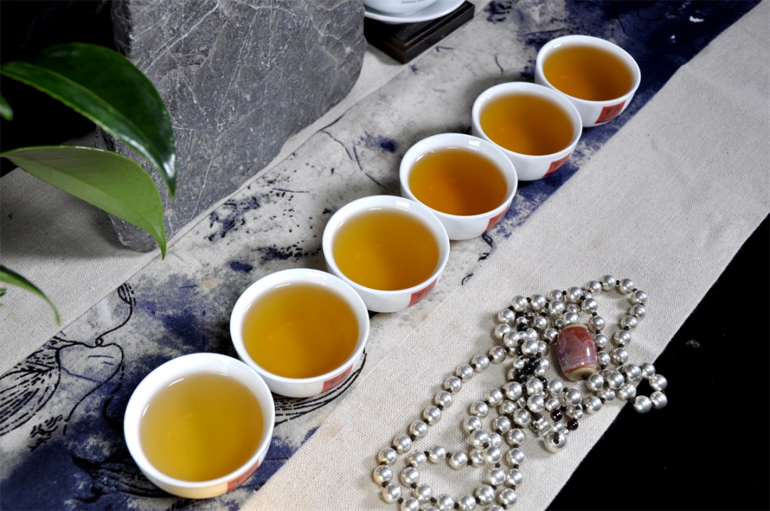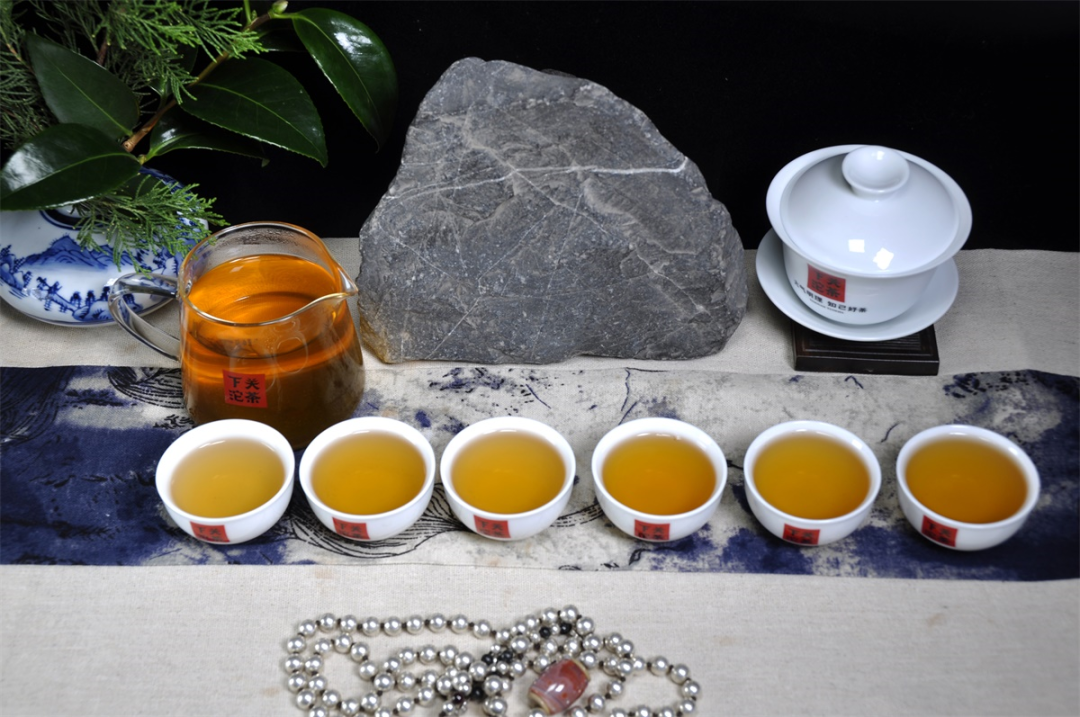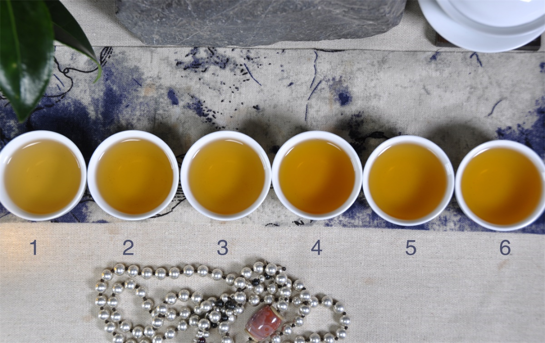 开汤品鉴,汤色橙黄通透。拼配中的春茶新料呈现出高扬的的香气,茶汤入口即能感受到清爽甜滑的舒畅口感,陈料的效果则体现在茶汤后段的喉韵丰富饱满,茶气强劲,回甘有力持久,霸气张扬。