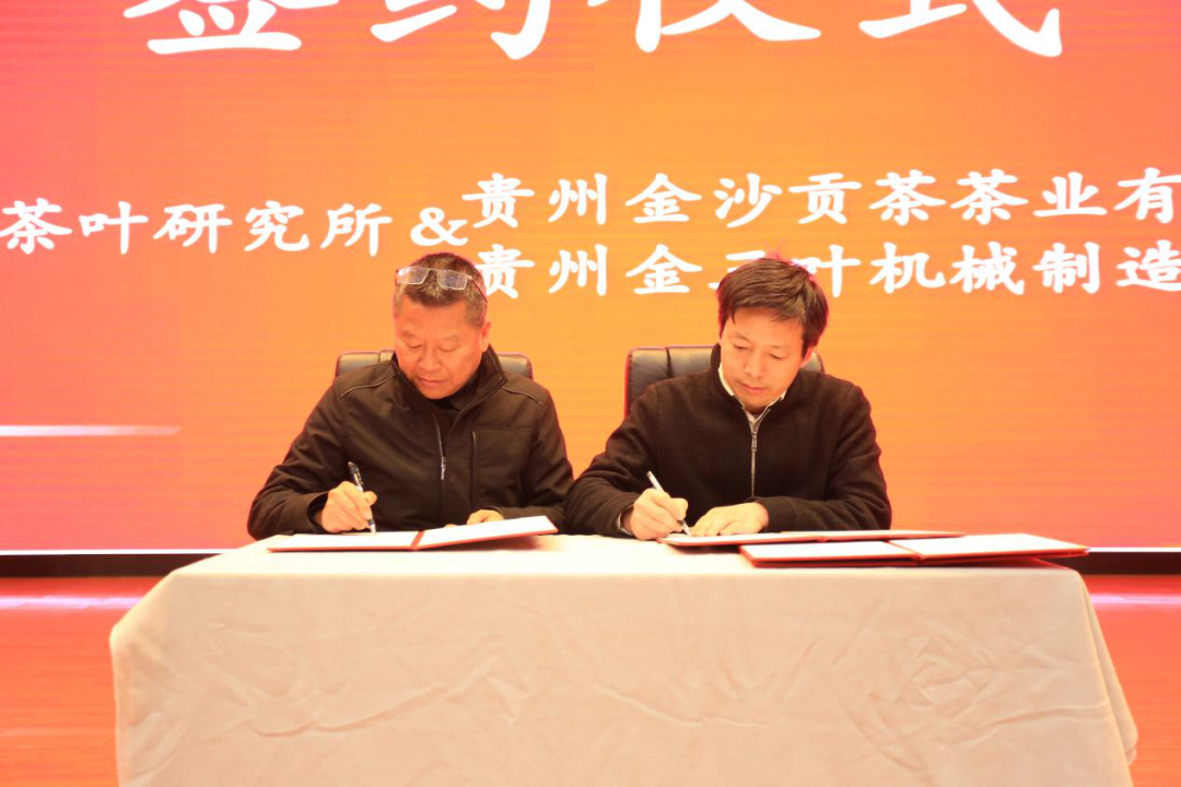 贵州省农业科学院茶叶研究所副所长杨文(右)与贵州金沙贡茶茶业有限公司董事长李国千(上图左一)、贵州金三叶机械制造有限公司总经理胡正军(下图左一)签约