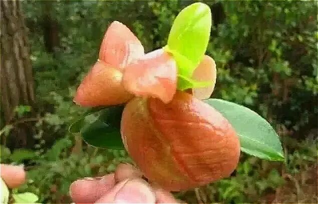 山林中的油茶树枝条顶端或者幼嫩的叶子发生了变态,长出来的另一空心肉质,如水蜜桃一般大小的果子俗称“茶泡”;而在幼嫩叶片下生长的另一厚肉型叶片俗称“茶片”,摘下就可入口,可以当水果食用。