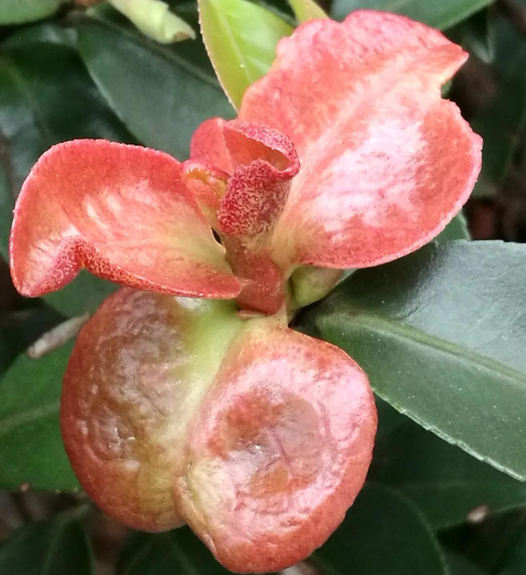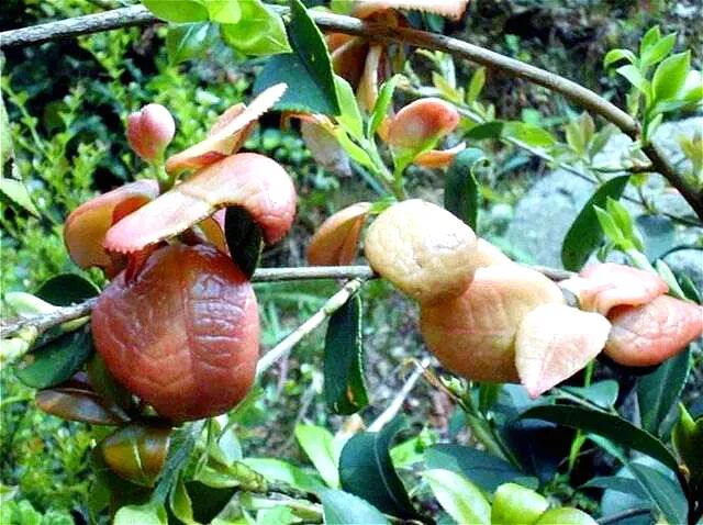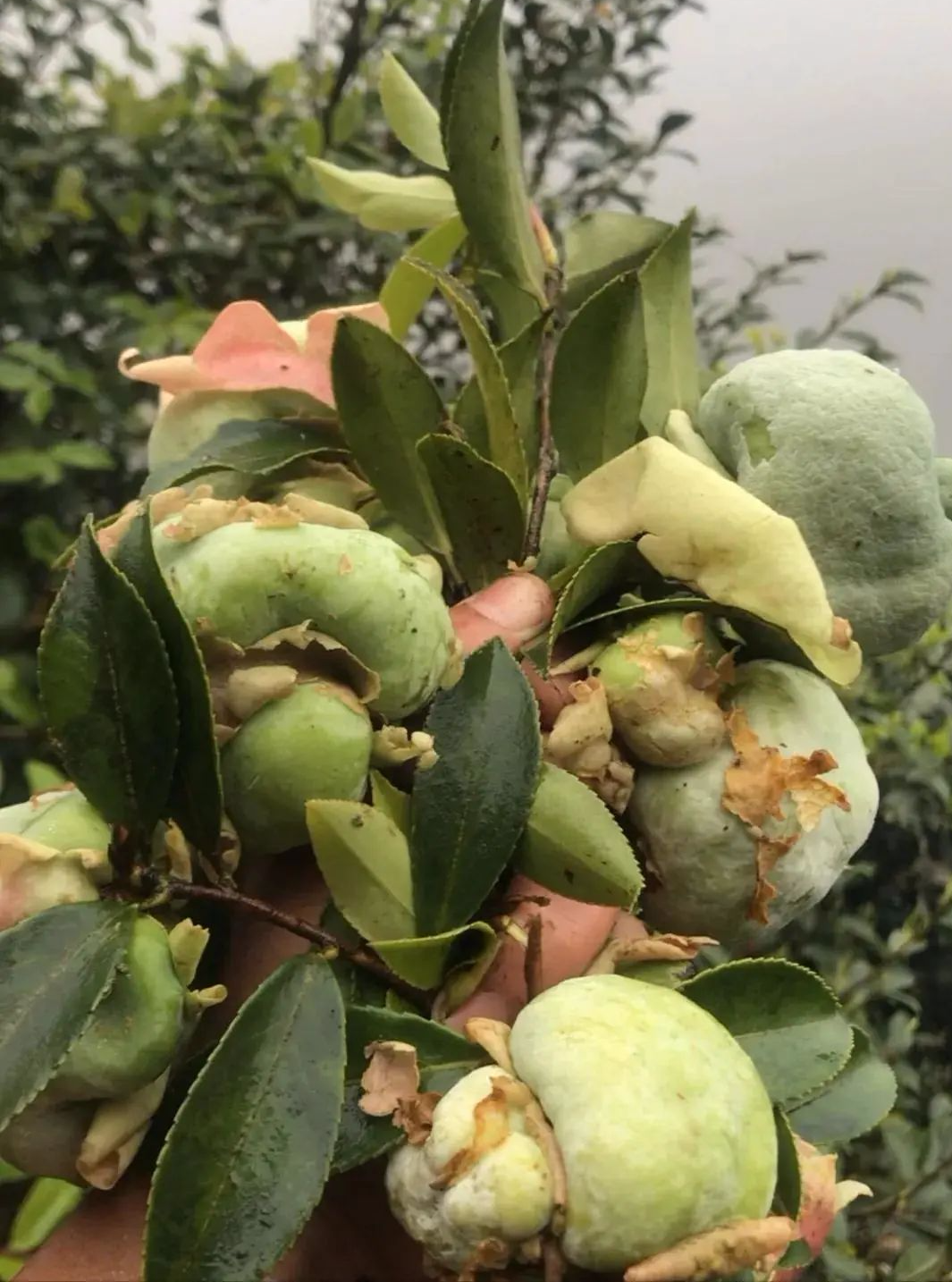 这种现象是茶树生病了,在清明时节,雨水充足,温度适宜,正好适应各种真菌的大量繁殖,油茶树的顶芽或嫩叶,受到茶泡菌的感染,引起油茶树顶芽或幼叶的叶肉组织细胞急剧分裂产生大量薄壁细胞,使顶芽变异成水蜜桃般大小的果实状的“茶泡”,而叶片则变异成厚厚的叶状体。
