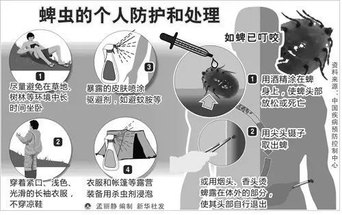 如被蜱虫叮咬,医学专家建议,可用酒精涂抹,使虫头部放松死亡,再用尖头镊子取出,并密切观察身体状况。