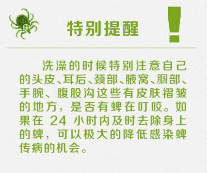 2、及时做好个人防护,提倡穿长袖衣服,不要穿凉鞋,扎紧裤腿或把裤腿塞进袜子或鞋子里。