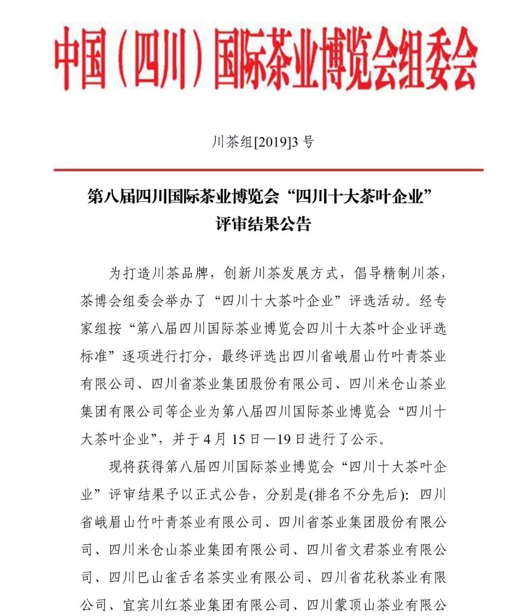 评选、评审“四川十大茶叶企业”,大力宣传川茶龙头企业品牌,是贯彻省委省政府“培育和提升精制川茶产业”相关精神,落实做大做强龙头企业、聚力打造川茶品牌、加快推动科技创新等工作要求,助推进一步做大做强川茶产业。5月3日-6日,第八届四川国际茶博会期间有关部门与组委会将举办“四川十大茶叶企业”盛大颁奖式,敬请期待!