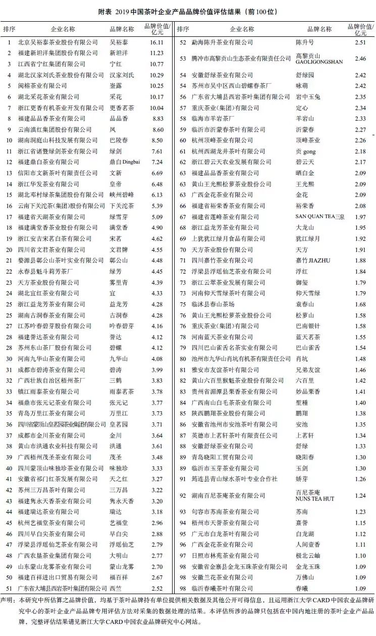 内容详见:《2019中国茶叶企业产品品牌价值评估报告》,中国茶叶,2019,41(7):19~37,作者:胡晓云,魏春丽,万琰。
