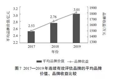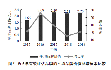 2019年,有效评估品牌的平均品牌价值略升至2.25亿元,增长1.81%(图5)。值得关注的是,从2016年至今的4年间,有效评估品牌的平均品牌价值始终维持在2亿元以上,未出现大幅变动。