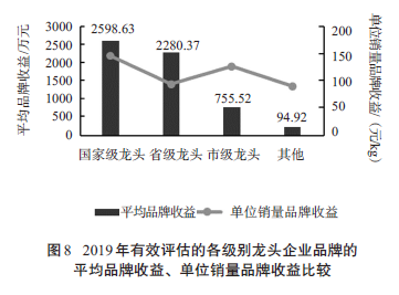 本次有效评估的173个茶叶企业产品品牌中,属于国家级农业产业化龙头企业的品牌,其平均品牌收益和平均单位销量品牌收益均为最高,分别为2598.63万元和145.17元/kg;来自省级农业产业化龙头企业的茶叶品牌,其平均品牌收益略低于国家级龙头企业的平均值,为2280.37万元,但其平均单位销量品牌收益却不到国家级龙头企业平均值的70%,仅有93.44元/kg;来自市级农业产业化龙头企业的茶叶品牌,其平均品牌收益虽然不及国家级、省级龙头企业平均值的三分之一,但平均单位销量品牌收益仅次于国家级农业产业化龙头企业产品品牌的平均值,为125.97元/kg (图8)。由此可见,国家级农业产业化龙头企业品牌的溢价能力最突出,省级农业产业化龙头企业的茶叶企业产品品牌虽然销量大,但品牌溢价能力却不及销量较小的市级农业产业化龙头企业品牌。