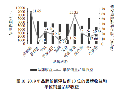 本次有效评估品牌的品牌价值前10位、前100位,以及有效评估品牌整体的平均品牌收益、平均单位销量品牌收益汇总比较见图9。分析本次有效评估品牌中品牌价值排名前10位的茶叶企业产品品牌数据,如图10所示,其品牌收益与单位销量品牌收益并不成正比。品牌收益排名前三位的品牌分别是吴裕泰(9197.90万元)、凤牌(7288.31万元) 和新坦洋功夫(6344.98 万元),但后两者的单位销量品牌收益排名却并不理想,仅以12.66元/kg 和8.21元/kg 位于第七位和第九位。而品牌收益排名平平的更香茗茶,其单位销量品牌收益远高于除吴裕泰之外的其他茶叶企业产品品牌,以55.35 元/kg 居单位销量品牌收益第二位。