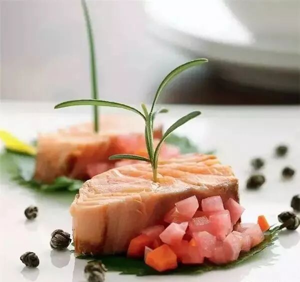 5.将用茶叶熏过的三文鱼切块,摆放于紫苏叶上,并插上迷迭香。