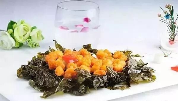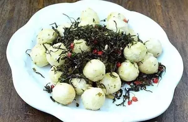 把炸过的汤圆和茶叶炒在一起,成菜汤圆脆糯,甜香不腻,茶叶酥脆。