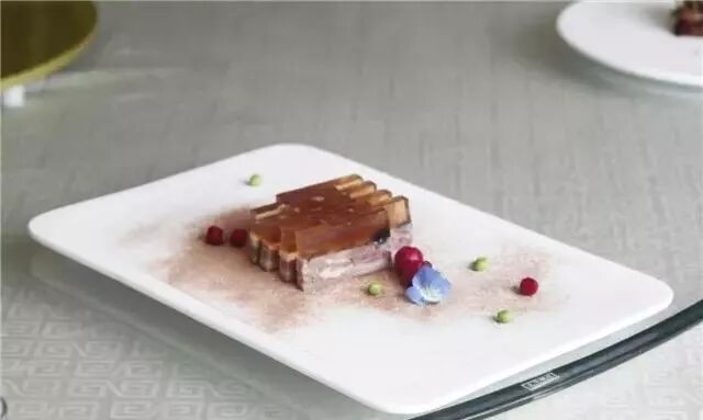 这里所说的肴肉,并不是江苏名菜里的“肴肉”。早些年,厨师在制作肴肉时,都会用到“硝”,现如今人们的饮食观念已经转变,加了“硝”的肴肉已经渐渐淡出人们的餐桌。是用德国咸猪手来替代肴肉,就是因为两者的口感很相似。制作时加入普洱茶汁和菊花瓣,是为了提升口感和卖相,同时也能体现出“绿色健康”的理念。