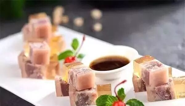 5、把咸猪手皮铺在小钢盘里,铺上净肉丁,再把鱼胶汁倒进去(没过肉面约1.5厘米为好),然后撒入菊花瓣,最后放冷藏柜里凝固成皮冻。切成方条装盘,再配姜汁米醋味碟上桌蘸食。