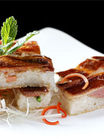 4.锅里放色拉油烧至五成热,把糯米鸭坯下入油锅炸至色金黄时,捞出来沥油,改刀成条再装盘,等点缀薄荷叶、葱丝和红椒丝后,配铁观音茶上桌即成。