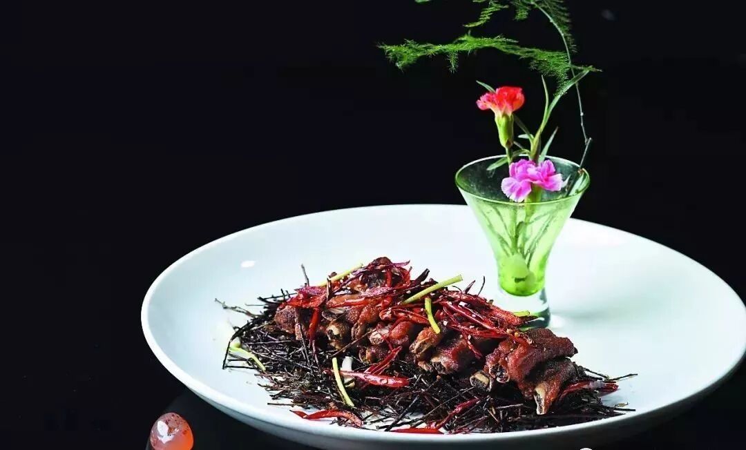 4.锅留底油烧热,加B料煸香,然后放入炸好的排骨段和茶叶梗翻炒,其间加入少量白糖、藤椒油,撒入熟芝麻,起锅装盘,稍加点缀即成。
