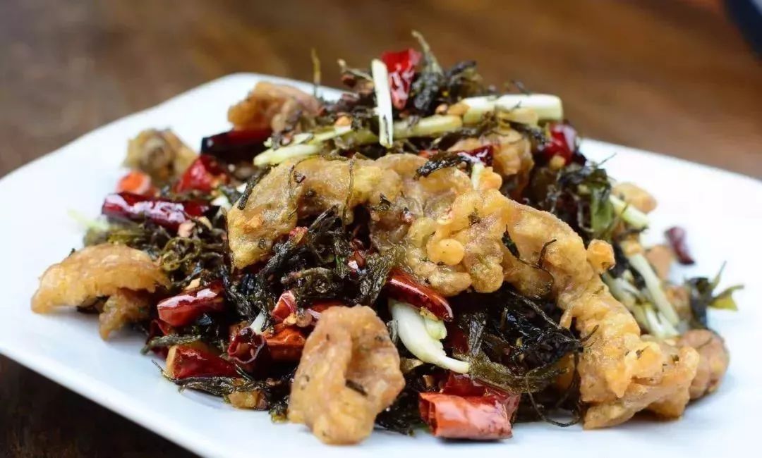 1.猪肥肠经过炸制后,下锅和炸过的茶叶一起炒制,成菜后肥肠外脆里软,茶香浓郁。