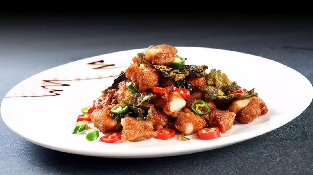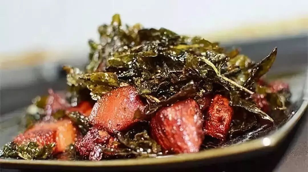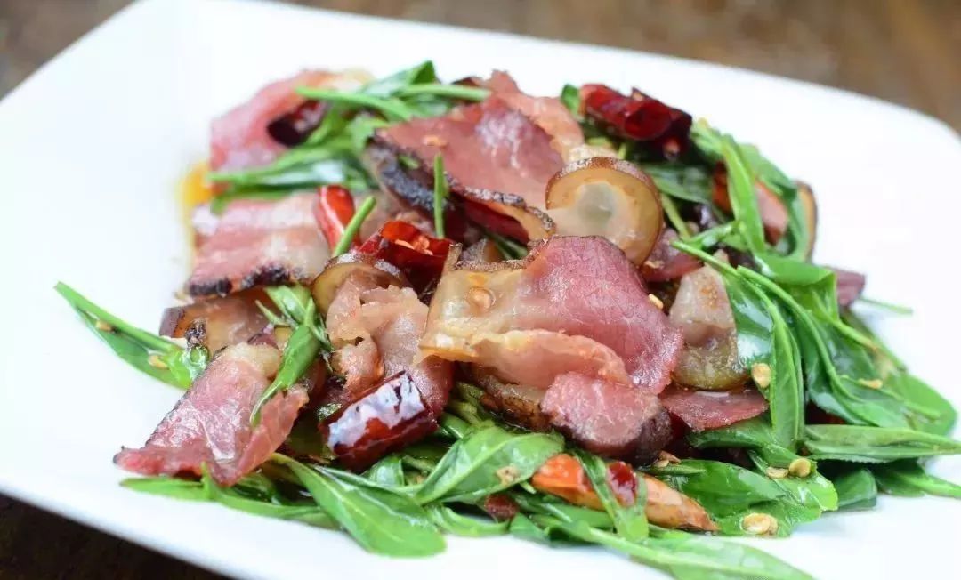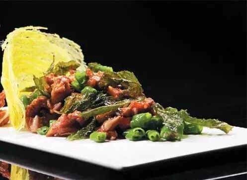 这是把老腊肉与新鲜茶叶一起炒制,成菜茶香可口,腊味地道。