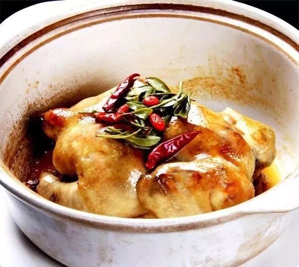5.把三黄鸡放砂煲里,放茶香汁、枸杞和泡涨的茶叶后,盖上盖子并送入烤箱烤25分钟,烤至肉熟且煲里的汤汁浓稠时取出来便好。