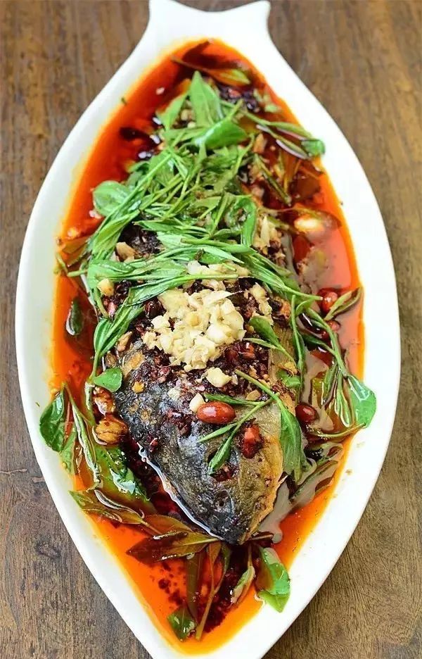 这道菜是用鲤鱼经过码味、油炸后,入锅加汤汁烧入味,最后撒上新鲜茶叶,用热油炝香而成。成菜色泽红亮,茶味飘香,质嫩麻辣鲜香。