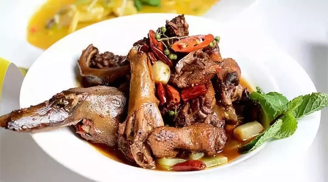创菜思路: 传统的啤酒鸭、红烧鸭子成菜汤汁较多,而这道鸭肴不仅成菜干香,而且青花椒的香味突出。制作过程中加入普洱茶水,能起到祛除鸭子腥味的作用,加红糖则可起到上色的作用。