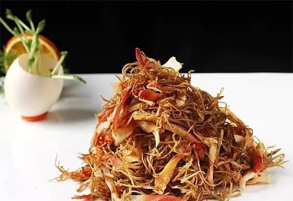 1.把北极贝唇切成丝备用。另把茶树菇撕成细丝,投入六成热的油锅炸至干香,捞出来沥油后,晾冷待用。