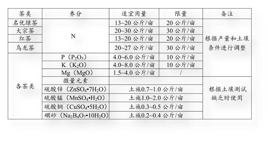 因此提倡茶园平衡施肥,主要以氮肥为主,配施磷、钾及中微量元素,结合测土配方施肥技术。一般地,磷、钾肥可作为基肥施用,氮肥宜作为追肥施用。