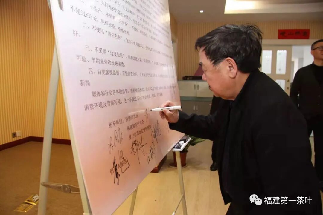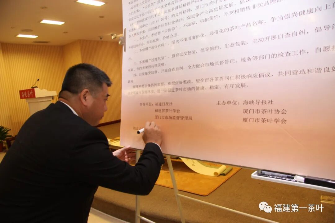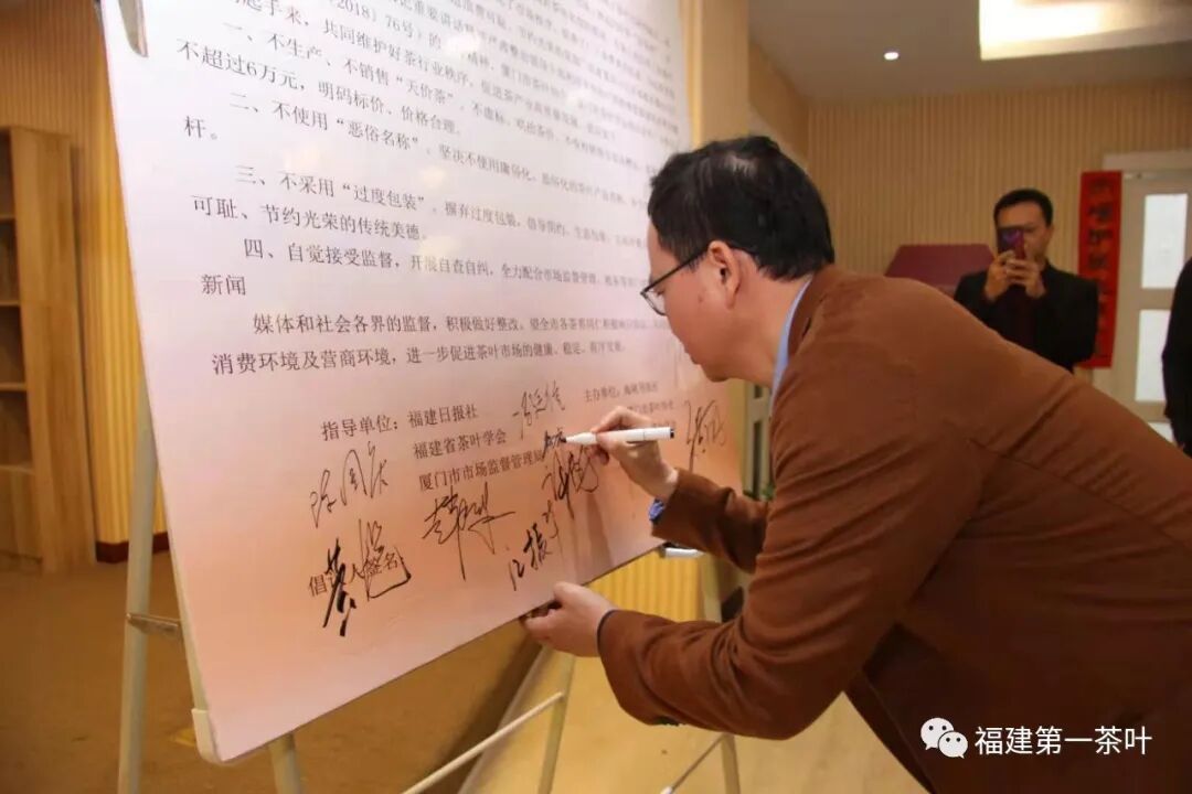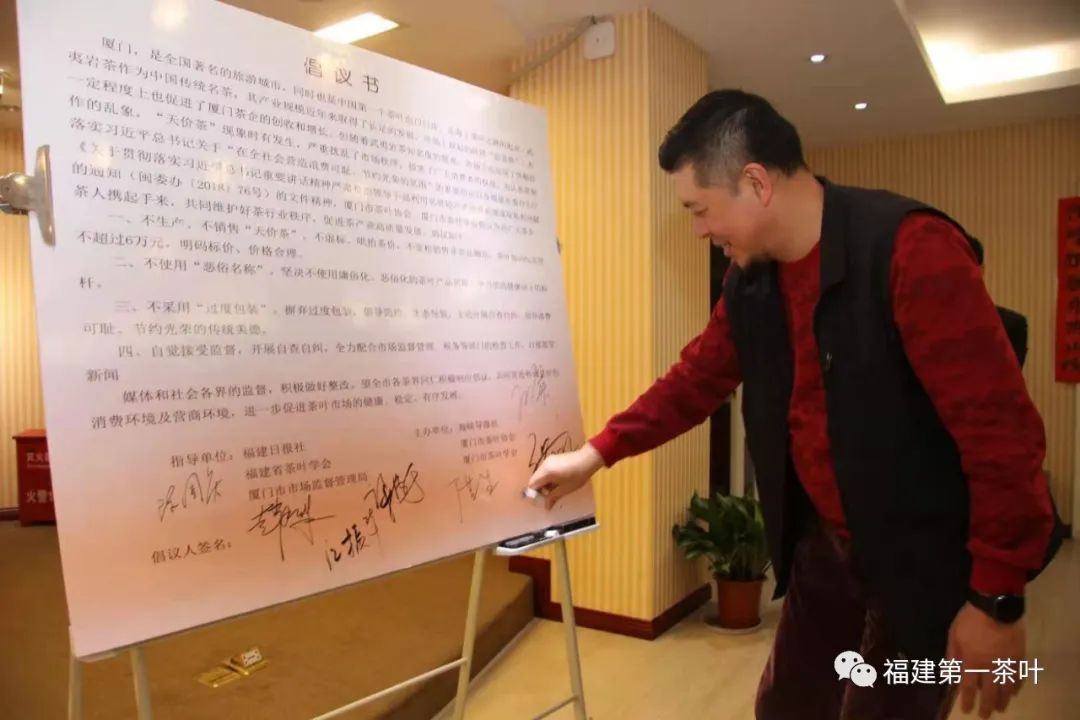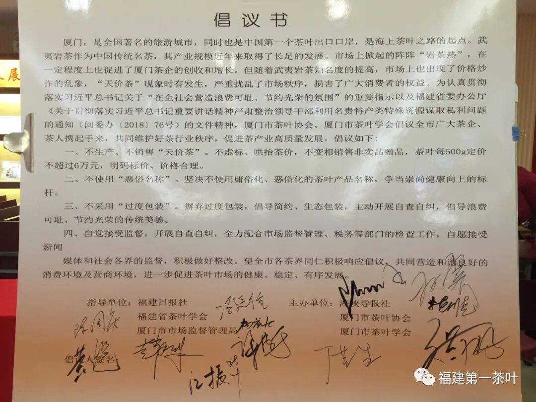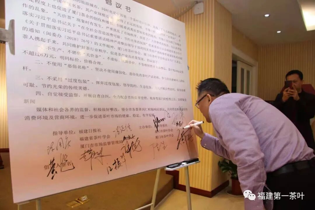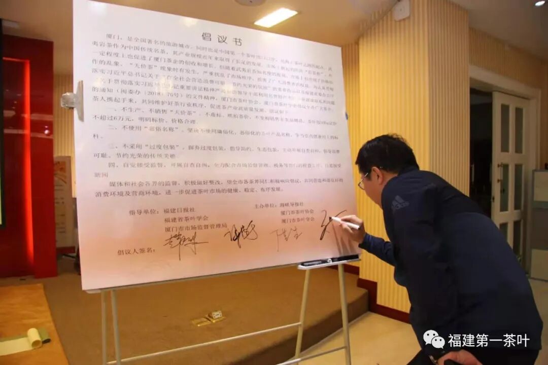 最后,在品鉴第九届海峡两岸秋季茶王擂台赛的茶王、金奖茶后,厦门茶叶协(学)会理事单位以上的12家茶企在反对销售“天价茶”的倡仪书上签字。