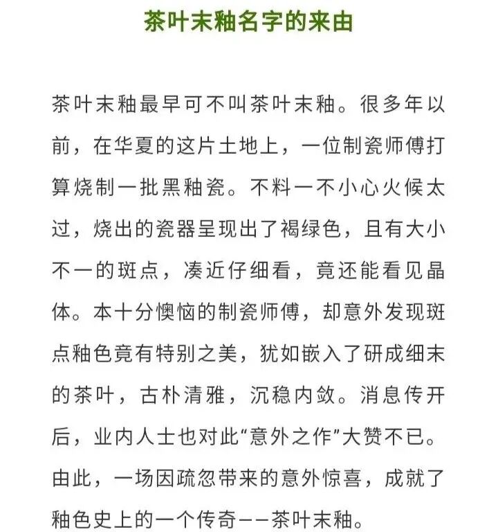 今人欣赏茶叶末釉的沉稳大气、内敛端庄之余,也许更应感叹:生活中的每个意外,不总是令人失落苦痛的,也许它正潜藏着巨大的惊喜。就像牛顿被苹果砸了发现地球引力一样,就像古制瓷师傅因火候疏忽诞生了茶叶末釉一样!