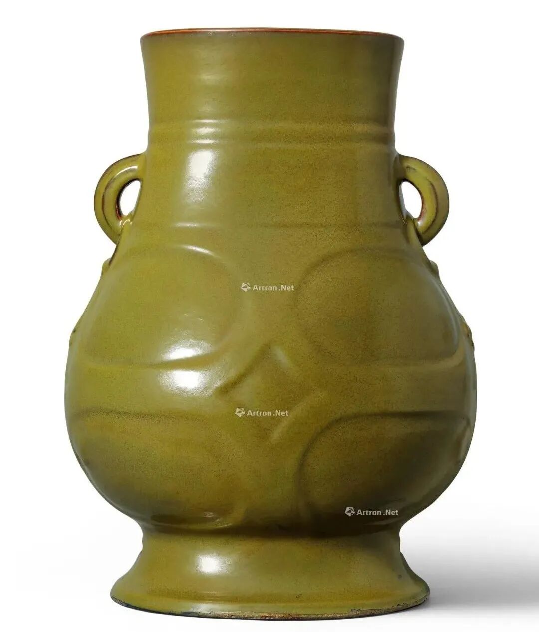 乾隆时期的茶叶末釉则茶末兼有,釉色偏绿者居多,俗称“蟹甲青”“茶叶末”等。有的也具古铜色调,称“古铜彩”。胎体细腻,瓷质坚密,胎壁比雍正时略厚,釉面匀净,有的带棕眼和丝纹,釉面色调有深浅之分,深者略显黑褐,浅者因黄色釉面上小黑点密集较多而显黄色,一般器足为黑褐色,仔细观察会发现足部釉与露胎釉相接处有刮削时无意留下的一圈小锯齿状边缘线。