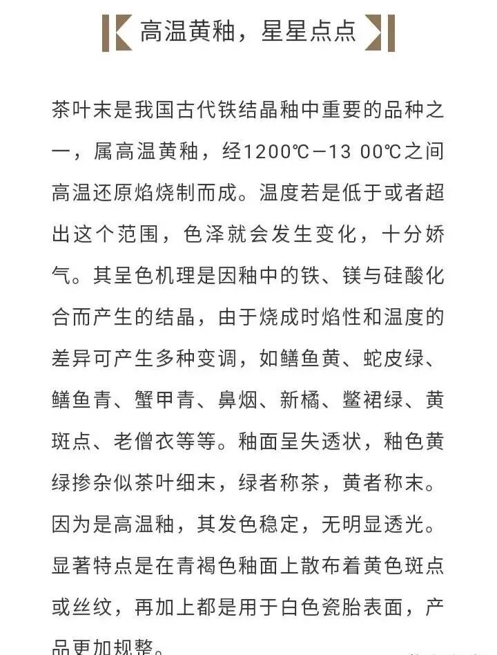 茶叶末釉,因釉吐灰绿,犹如茶叶之色而得名。上好的茶叶末釉,就像茶叶末似的呈灰绿色。暗绿的底色中密密麻麻的掺杂着黄褐色的细点,非常古朴耐看。