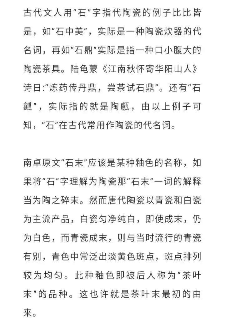 《陶雅》中记载:“瓷以黄黑相间者,谓之茶叶末。其黑色较浓,而又有黄色碎点于底足内外围绕一遭。瓷致活泼者,则谓之鳝鱼发。以成化仿宋者为上。绿多而无碎点者,厥为蟹甲青。有垂沫星若水眼,或如栈眼者,命曰新桔。其绿色亦较浓也。”“茶叶末以滋润,鲜明,活泼,三者为贵矣。茶叶末黄杂绿色。娇娆而不俗。艳于花,美如玉,笵[fàn]为瓶,最养目。”