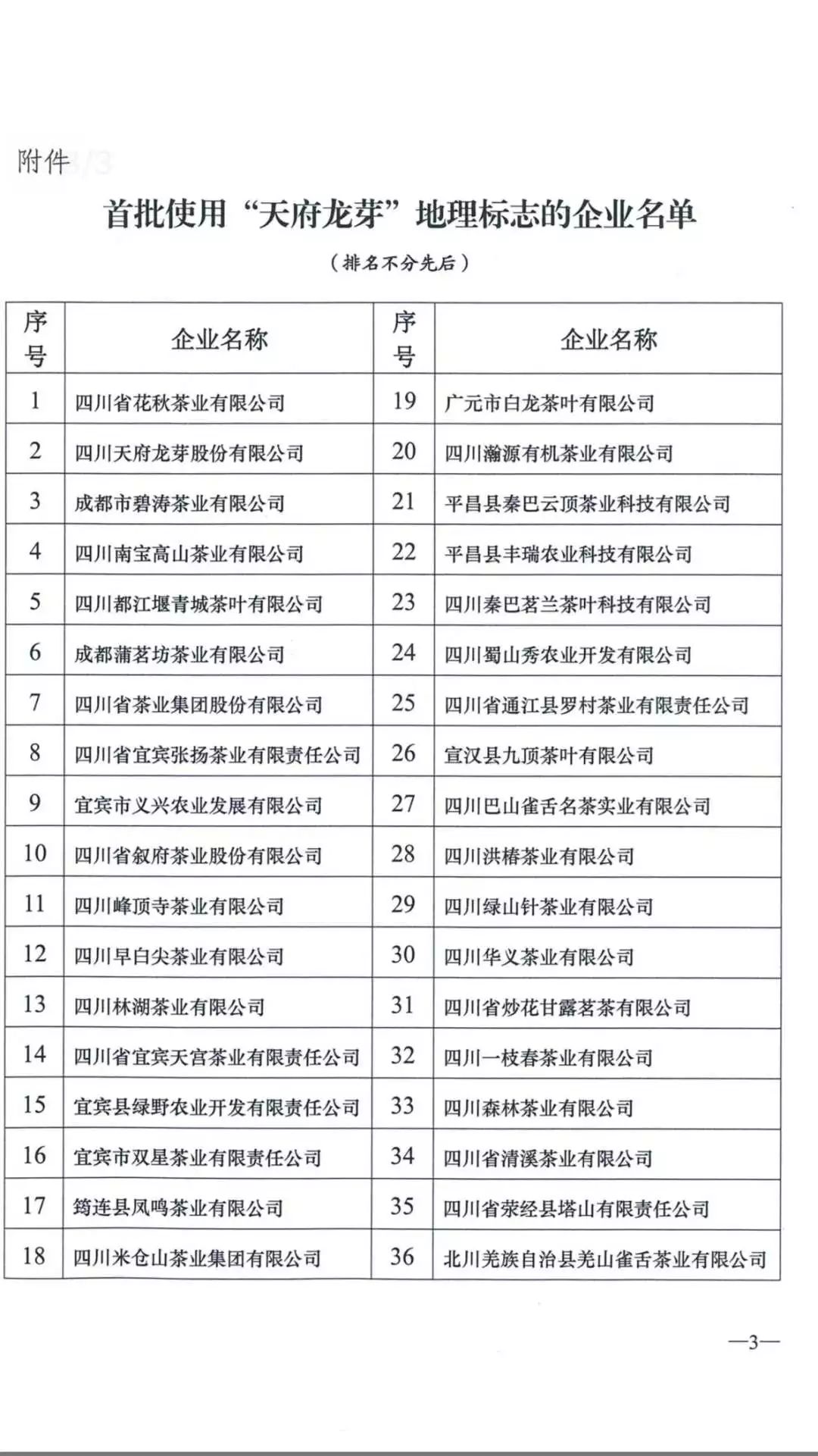 四川省花秋茶业有限公司、四川省茶业集团股份有限公司、四川米仓山茶业集团有限公司、四川省天府龙芽股份有限公司、四川叙府龙芽茶业有限公司等36家四川龙头茶企成为首批统一使用“天府龙芽”地理标志企业。据介绍,这是四川茶主产区“ 三山一早”36家企业率先抱团高质量发展,塑造品质品牌川茶,擦亮川茶金字招牌。