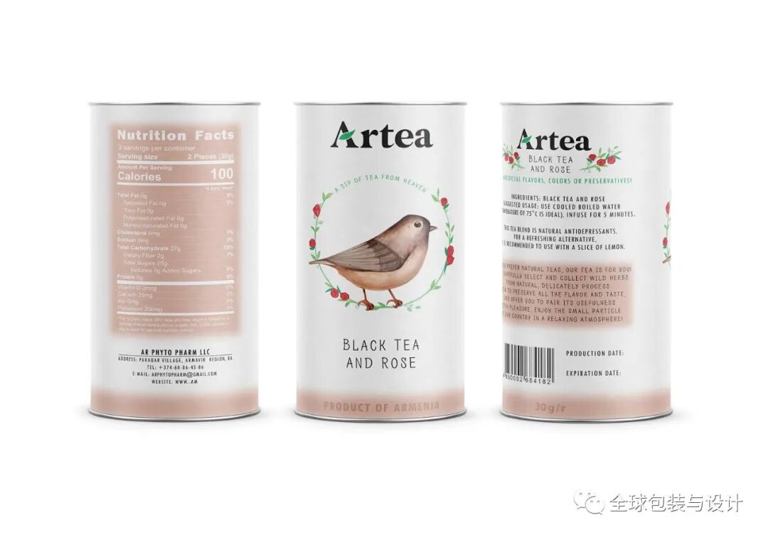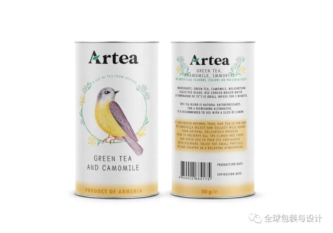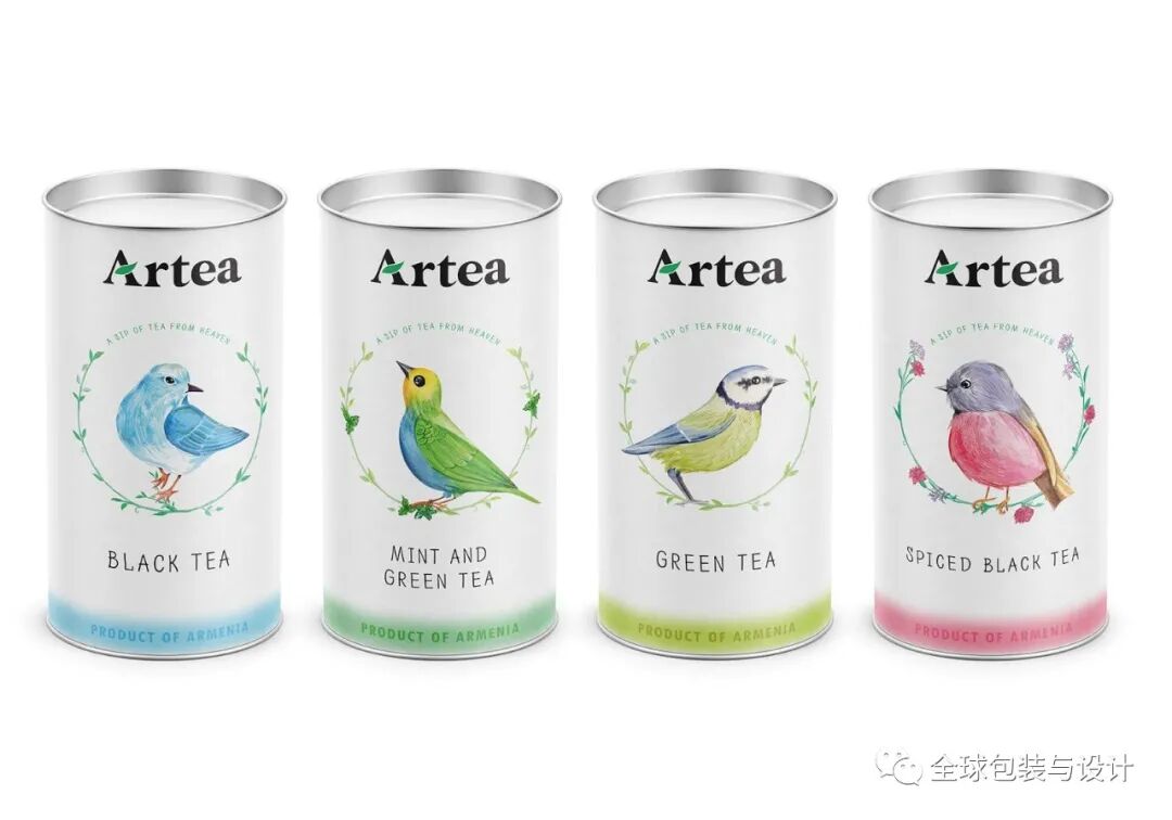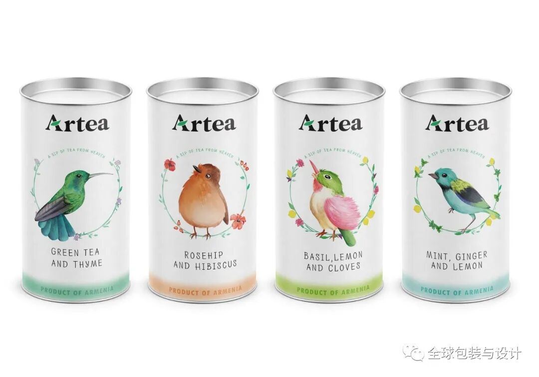 “Artea ”是一家亚美尼亚茶叶公司,自2005年以来生产草药茶。制作不同美丽鸟类的插图。每种茶味都有自己的颜色托盘和插图。纯白色作为背景色和彩色插图的使用使这成为一个高端的专属范围。选择了现代和简约的包装设计,将消费者的注意力集中在形象本身上。