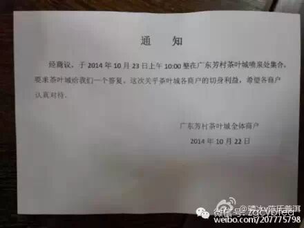 另外,小编还从侧面了解到,此次集会罢市的芳村茶叶城,只是大芳村茶城中的一个商城,由于这次加租,该商城已经有一部分商户,在店面到期前,找好了别的茶城,或者正在别的茶城寻找合适的店面。