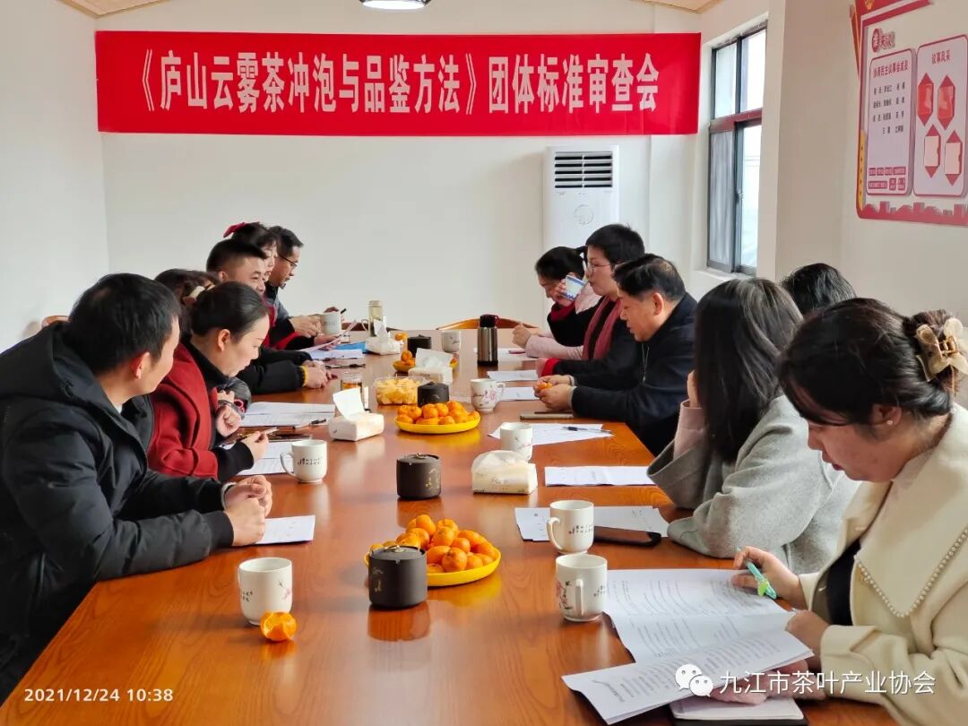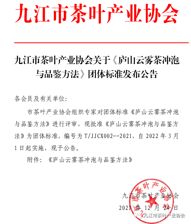 继九江首个茶叶类团体标准——《农产品地理标志产品 庐山云雾茶》发布后,2021年12月24日,由九江市农业技术推广中心、九江职业大学、九江市庐山茶叶科学研究所三家单位起草的《庐山云雾茶冲泡与品鉴方法》 团体标准在全国团体标准信息平台发布,标准号为T/JJCX002--2021,自2022年3月1日起实施。