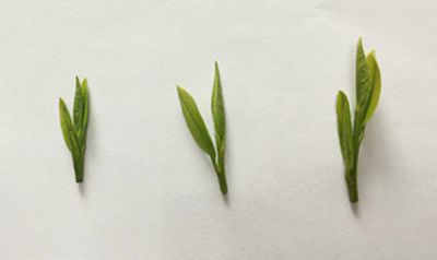 茶叶采摘应根据茶树品种特性和茶类要求从新梢上采下符合要求的芽叶,不能见芽就采,有的品种较耐采,可多采,而相反的应少采。采摘依茶类不同,可分为高档名优茶的细嫩采、大宗茶类的适中采、乌龙茶的开面采和边销茶类(黑茶、砖茶)的成熟采等。对幼龄茶树来说,正处树冠培养阶段,1~3年树龄的茶树基本不能采,应留较多叶片;3~5年树龄茶树为扩大树冠,实行“打顶养蓬”;5年树龄以后,树势好的可正常采,树势弱的应注意留养。名优茶芽叶 不合格芽叶
