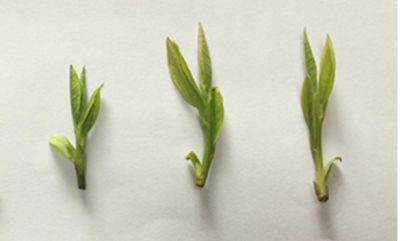 茶芽有两个明显特性,即顶端生长优势与多次萌发生长。新梢生长时,顶芽最先萌发,生长亦最快,抑制了侧芽的生长,如及时采掉顶芽,腋芽就能快速生长。所以,按标准及时分批采,就能取得促进发芽的增产效果。依芽的生理状态,分越冬芽(或休眠芽)、活动芽和休止芽(俗称“驻芽”)。