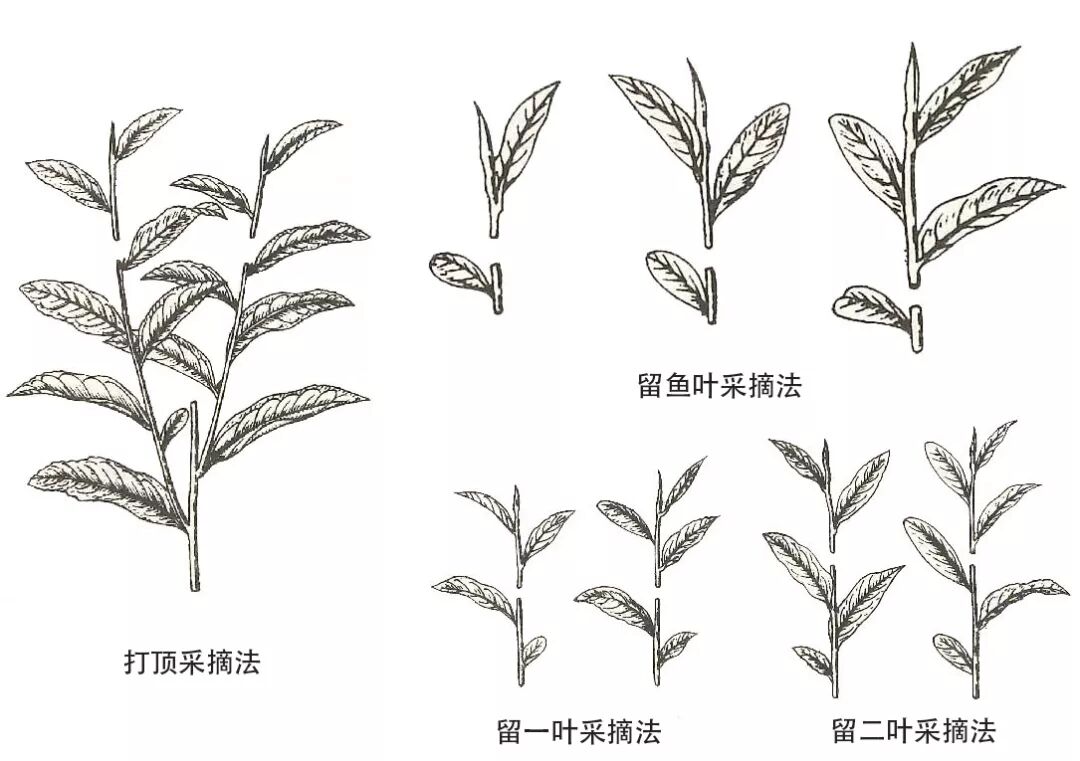 采摘的手法因手指动作、手掌朝向和手指对新梢着力的不同,形成多种方式,主要有折采、提手采,而使用如捋采、扭采、抓采等不适当的采姿,将严重影响采摘鲜叶的质量。