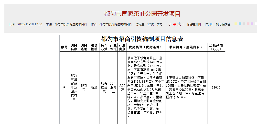都匀市国家茶叶公园开发项目:主要建设山地茶旅休闲区用地300亩,茶文化体验区占地150亩,康养度假区50亩,茶叶交易中心区50亩,精制茶加工区占地50亩,绿色生活园占地150亩。