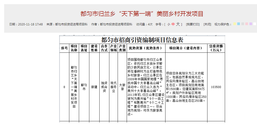 都匀市归兰乡“天下第一端”美丽乡村开发项目都匀市人民政府网截图